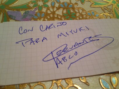 バーレッスンの日♪フラメンコから、少し離れた基礎レッスンを。しっかり体全体を意識してプリエやアチチュードをすること、私にとっては、バーに頼れていても、それをキチンととやるだけでも大変です☆でも、こういうレッスンがどれだけ大事かは、理解できるようになってきました。明日のシギリージャのパーソナルに、しっかり、活かさねば、ねで、今日は。レッスン後は西日暮里のタブラオ、アルハンブラへパブロ先生がカンテということで、先生が誘ってくださいました 初めて聴いたパブロ先生のカンテ♪甘くて優しくて、とろけました、ワタクシ声量はあって力強いのにね~。ツボは、なんと言っても、ハレオ♪ブレリアとかタパの、オシャレ~なハレオ、あれは癖になるわ~『とまとまとま~』に、やられた(^q^)先生も身をよじって喜んでました(笑)それで、今日はちょっと、自慢(^o^)v休憩時間に、先生がパブロ先生に会わせて下さって、サインを頂いてしまったのですよ!うひょ。それが、コレ夢のような出来事に、神様を信じたくなりました♪そもそも、何度もパブロ先生に会ってきなよ~って言われても、一人じゃいけないってひるんでる私を引っ張って、先生が、この子がお会いしてサインが欲しいって言ってると伝えて下さったわけなんですけどね(笑)今日踊った方のシギリージャ、かなり今習っているものと似ていて、参考にもなりました。明日のレッスンもガンバるぞ~!そうそう、来年の発表会のこと。アルハンブラに決定しましたよ。11月3日(日)。休憩時間に、店長さんと、打ち合わせをしまして、規約その他がこちらの条件にぴったりで、その場で即決!完全なペーニャスタイルで、楽しくなりそうですよ~(^з^)-☆