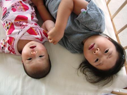 yurayura生まれて2ヶ月たちました。1ヶ月 実家で大人用のベットに寝かしていたら。動きまくり!?!?下で寝ていたハハの頭 に落ちてきた。90度回転していたことも。。。手と足をばたばたばたばた動かす。1ヶ月過ぎ 目で物を追うようになり。1ヵ月半 『おっこ~ん』とおしゃべり。 名前を呼ぶとにっこりと笑う。この笑いとろけそう~。ますます、てとあしをばたばたばたばたと動かす。ゲンコツおしゃぶりが上手になる。2ヶ月 推定体重 5.7キログラム 推定身長 58センチ と大きく成長。母乳様様。 起きているときはご機嫌なことが多い。お話をよくするように。おっぱいを飲んでから、お話をしたりしてからふんがふんが言い出して一声オギャッと泣いた後に吸い込まれるように寝てしまう。myumyuの時には考えられないぐらい。myumyuはチュウチュウとおしゃぶりが絶対離せない。抱っこじゃなくっちゃ絶対寝ない。ベットに置いたらすぐに起きる。。。よくふがふがふがふがと泣いた。というか、3歳になっても泣き虫ちゃん。yurayuraは全く逆。チュウチュウおしゃぶりは1回ぐらいしただけで。。。今は全く拒否。哺乳瓶もダメ。。。生後2日目からオッパイだけだから哺乳瓶知らず。仕方がない!?!?白湯を飲ますのにどうしよう!?!?!?と違いがたくさん。これが個性と言うものなのね。姉妹でも全く違うんだ。この先が楽しみ!!myumyuと1つだけ似ているところが。それは、寝返り。myumyuは2ヶ月半で起こり泣きをしながら簡単によいしょっと。yurayuraもその気配あり!?!?!?!?7月30日のひとこま