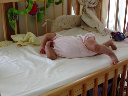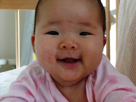 yurayuraが生まれて明日で3ヶ月が過ぎるところ。60センチ、6.5キロのビックガール!!(今のところ)ようやく。myumyuをはじめ、4人での生活に慣れてきた~。ハハはmyumyuと毎日格闘(yurayuraはとてもおとなしく、myumyuのときでは考えられない程。少しフガフガと泣いて、次ぎ見ると寝てしまったり、ベビーカーもきちんと乗りしかもかってに寝てしまう程。)してきたが、myumyu最近とても心が穏やかになってきた様子。泣く回数も減り、ちょっと本当の意味で『おねえちゃん』なった感じの今日この頃。毎日の格闘中に、mymuyuを怒りすぎていたハハ。それが習慣になってしまっている今日この頃。なんだかmyumyuが恐縮している感じがしてたまらないハハ。ハハの一言でmyumyuは自分の意見を変えてしまったり威圧感バリバリのハハ。。。なんてかわいそうなことをしてしまったのだろう。。。ハハは必要以上に怒らない、口を出さないようにしようと心に誓ったよ。と、なかなか難しいけど。がんばります。どうか、今までのmyumyuに戻ってください。ビックガールyurayura。寝返りが打てるようになり、ハハを呼ぶ回数が増えた。ちょっと大変になってきたハハ。2人目は出来ればゆっくりと成長して欲しいと思うが。。。スクスクと成長してくれているのでyurayuraに感謝。最近、寝るときの体勢が面白い。大の字で寝ることは多いのだけれど、時々横になって寝ている。ある時は横になり腕を首の下に入れて寝ていたり、鼻にゲンコツを押し付けたまま寝ていたり、一番驚いたのがベビーベットの柵を固く固く握り締めて熟睡。。。しかもこの顔で。面白いのでパチリ。