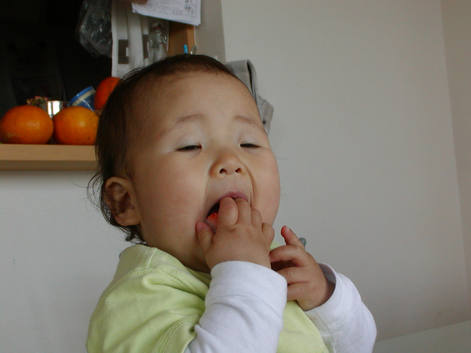 yurayura。あっという間に大きくなってしまっています。11月ごろから離乳食を始めました。このころからなんだかハハは手一杯に。。。1月ごろから一人座り、つかまり立ちが始まり、すぐに伝い歩きに=====333まってくださいyurayura。ハハは準備ができておりません。あっという間に、3月26日のちょうど10ヶ月になったとたんにパタパタパタと歩き始める。と同時に意味のある言葉が出てきた。『パパ』が一番初め。誰でもパパ。パーパーと叫んでおります。その次は『ワンワン』。。。『ママ』はというと、ワンワンに負けて3番目。今は『ちゃちゃ』も増え、だんだんと意思疎通ができるように。言っていることはほとんど理解をしている様子。はやいねー。myumyuの時とほぼ同じぐらいというか全く同じぐらいの成長中のyurayura2人目はほんと見ている暇がないのか1人目を見ていて感動が薄れているのか!?!?!?!?myumyuと少し違うところは、食欲。離乳食は苦手なものは全くないといってもいいほど。味がいやで口からべぇーっと出したことがなく。ハハはとても助かっております。量も半端ない。myumyuのときはベビーフードはあまり食べなかったけれどもyurayuraはほぼ完食。足りないぐらいのときも。。。yurayuraは本当に何でも食べちゃう。魚に肉に貝に蕎麦に卵に。。。myumyuの時はとてもゆーっくりとしていたと思うのだけれど。すごすごyurayuraその食べっぷりに脱帽です。ただいま手づかみ食べの真っ最中。すごいすごい。myumyuの時と同様にyurayuraにも好きなように汚してもいいから手づかみでやりたい放題に。myumyuはきれいに食べていた記憶なんだけれどもyurayuraは。。。手づかみで食べるスピードが速い。次々に口に入れる入れる。手はもちろん、顔も服もテーブルもいすも床も。。。食べ散らかし屋さん。ハハはyurayuraの食事が済むと疲れ果ててしまうほど。。。そんなyurayuraのただいまの大好物。トマト、いちご、ぶどう、うどん、そば、らーめん、パスタ中でも、トマトはスーパーで見つけると抱っこしていても身を乗り出してトチャトと叫びながらアピールアピール。少々困るほど。。。急成長中のyurayura。