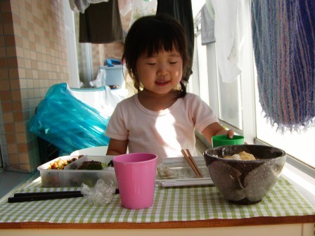 2、3日前のとてもとてもよーく晴れた日。お昼ご飯の時間。いつも麺類ばかり食べ過ぎのmyumyuとハハ。今日は、朝ご飯の残りやら簡単レシピでご飯食に。最近、ご飯の時にmyumyuに小言を言ってばかりのハハ。昔は違ったのに。。。もっと楽しんでご飯を食べて多様な気がする。あっ。そうだ。ピクニックしよう=====3yurayuraはとても気持ちよさそうにお昼寝中。天気よくて、公園にでも。。。暑すぎるや~。。。そうだ、ベランダピクニックにしよう!!myumyuはとても嬉しそう。張り切るmyumyuにせかされながらお弁当箱に、適当におかずを詰めて、ベランダへゴー!!新聞紙を引いて、ミニテーブルを出して。ちょうど、洗濯物で日陰になってるし、心地よい風がそよそよそよと。なんだか、気分転換に!!myumyuノリノリのお気楽ピクニック。 モグモグたくさんたべました。 息抜きにいいね~。