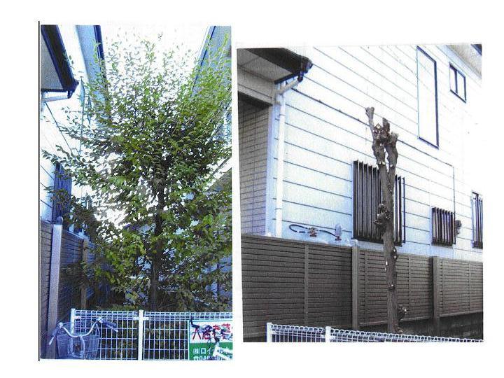 蓮田のライト君の樹木伐採。11月に管理会社へお願いしておりました。「手配しておきます」といわれ、早2週間。どうなったか確認してみると・・・・『すみません。12月1日に完了しています』とのこと。何かあるわけでは無いけれど、事前に日程を教えて欲しかった~。ということで、伐採前と後の写真をいただきました。これだけバッサリやっても、来年にはまた伸びている。自然の力ってすごいです。伐採費用(処分代込み)は12,600円でした。(もっと安いところがありましたら情報ください)TVショッピングで高枝切りバサミを購入して、自分でやった方が安上がりなのですが、処分場まで運ぶ手段が無いので、業者任せです。近頃はゴミを捨てるのも一苦労です。