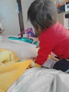 おはようございます! 一夜明け、サンタさんの来訪を受けた我が家です。 プラレールに夢中になっているリョーヘーです。 音が鳴るので、リョーヘーも興味津々(゜〇゜;)????? いっちゃんも袋に入っていたオモチャに夢中です。 いっちゃんのオモチャにも興味を示すリョーヘーですが、まだいっちゃんは貸してくれないので、泣きそうです(。´Д⊂) 残念ながら私ともっちゃんの枕元には、アパートは置いてありませんでした。 『大人のところには来ないんだよ<(`^´)>』といっちゃんにも言われました。 チェッ(・ε・` )