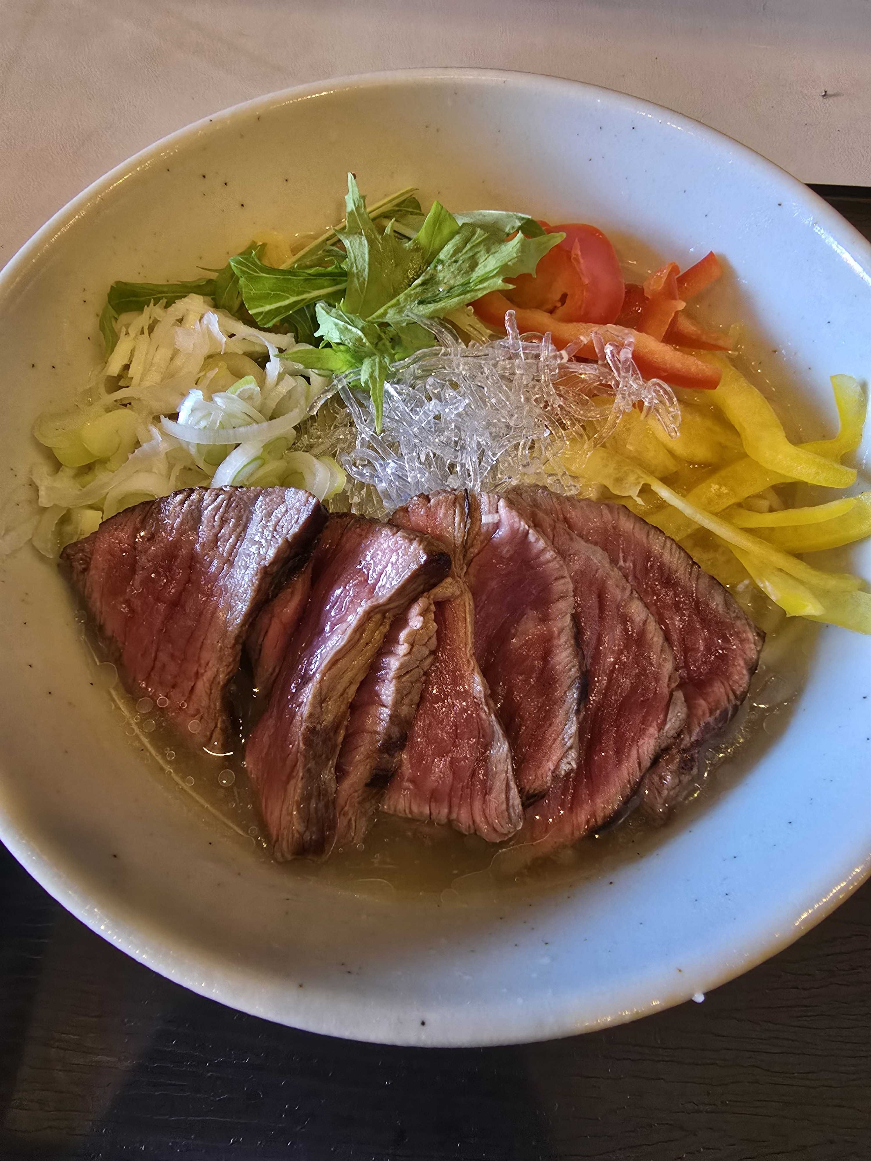 暑さで食欲が落ち気味な日、ふと出会ったのがこの「牛骨スープの冷麺」。まず目を引くのが、しっとりレアに仕上げられた牛肉。赤身の旨味がギュッと詰まっていて、一口噛めばじゅわっと肉汁が広がる…これ、焼肉屋顔負けのクオリティです。そして主役はなんといっても「牛骨スープ」。 あっさりしてるのに、コク深くて、冷たいのに心がホッとする。この優しい塩味と旨味のバランス、ハマります…!麺はつるっとのど越しが最高。そこに、シャキシャキ野菜(パプリカ、水菜、白ネギなど)がたっぷりで、ヘルシーなのに満足感抜群。ガツンとパンチがあるわけじゃないけど、静かに感動する一杯でした。 覚の一皿でした。送料無料!短期集中目標★美味しいから続けられる置き換えダイエット牛骨スープ【痩美健・旨だしスープダイエット】ダイエット/食物繊維/置き換え/プラセンタ/コラーゲン/低カロリー/美容/つばめの巣/健康食品/スープ/粉末/ダイエット食品 ファスティング 置き換えダイエット