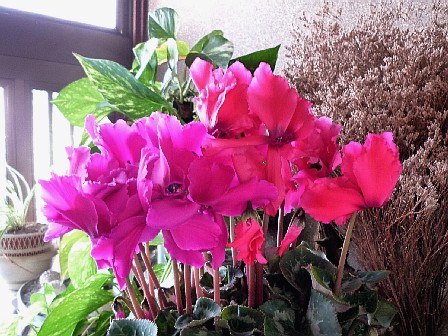 シクラメン今朝は昨日より4度ほど高くてマイナス8度よく晴れてて風もなくお昼の気温も5度近くまで上がったようですこのまま寒波が弱まってくれればいいな~などと思いながら庭の落ち葉を片付けて・・・桜の木桃の木の葉っぱが全部落ちたので落ち葉掃きはこれで終了年賀状は今日だんな様が仕上げてくれたのでこちらもOK!!残り1週間あまり あっちウロウロこっちウロウロとお掃除の真似事をして2009年も終わって行きそうです