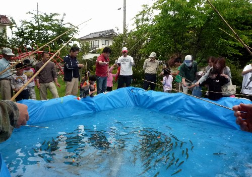 昨日のこと心配されてた雨も朝にはあがってニジマス釣り無事終了!お年寄りから小さな子供まで200人あまりの参加と大盛況私は釣り上げた魚をさばく係小学校5年生くらいの男の子がお手伝いしてくれて上手に魚のお腹を開ける手さばきにおばさんはしっかり負けてました^^;うつぎ