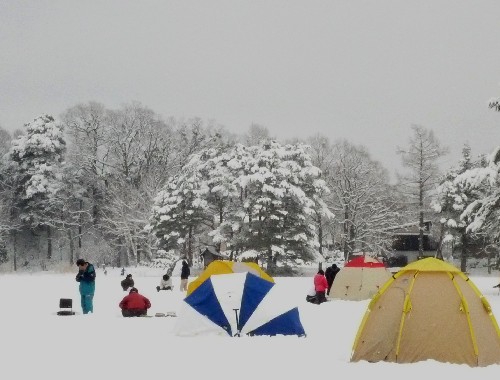 今日は大寒昨日からの雪が降り続いていますこの冬初の大雪ですと言っても15センチ位でしょうか久しぶりの雪景色を楽しんでいます乾ききった空気も少しは潤うかも降り続く雪の中穴釣りのメッカ「松原湖」まで様子見に・・・湖面には色とりどりのテントが並んで大賑わい早速この日のためにゲットしたテントを広げて皆さんの仲間入り!でもでも 待てど暮らせど当たりはナシ^^;公魚さんに見向きもしてもらえず今日のところはひとまず退散ということで次のお休みにはかならずリベンジを(笑)だんなさんがせっせと作った作った竿も試してみたいし結果はまたご報告します