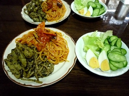 昨日夕方から夜中にかけての雨のせいか今日は比較的過ごしやすい日になりました今は冷たいほどの風が窓から入ってきています義母がデイサービスの日なので昼食は主人と二人だけ沢山取れたトマトでソースを作りパスタになんて思いつきそろそろ出来上がるかなというときに大きなお皿を抱えた娘がやってきましたこちらは沢山取れたバジルを使ってやはりパスタです偶然にも二人ともパスタを思いつきちょっとボリュームのあるお昼になりました(^^♪