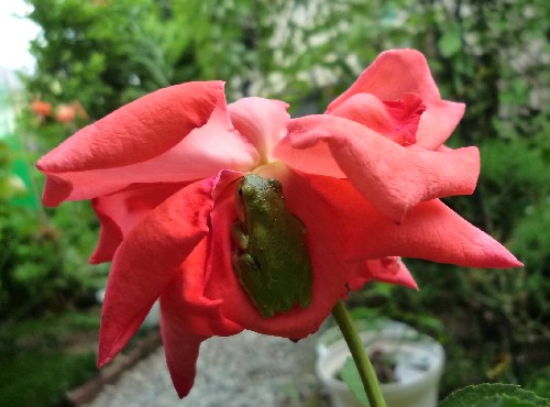 もう萎れて散り掛かったバラの花びらにしがみついてるカエルさん他のバラの花の中にもはいってるのを見かけることがありますけどよっぽどバラの花が好きなんでしょうねカエルさんといえばこの頃カエルさんと遊ぶことに目覚めた「はる」庭のあっちこっち探してはい掛け回してますでもカエルさんのほうがジャンプ力が強いようで逃げられてばっかり(笑)まあそれでなくっちゃカエルさんがかわいそう