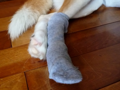 暑いので階段の最上段で涼んでるはる今日も朝から暑い日です大雨で被害の出ているところもあると報道されてますけどこちらはピッカピカ!さっき温度計を見たら北側の外でも31℃を指していましたこの暑い中「はる」は靴下を履かされていますアレルギーの痒い痒いが高じて足の指の間の皮膚を掻き壊してしまったんです暇さえあればなめたり噛んだりして掻いているので何とかならないかと考えたのが靴下私の古くなった靴下を細く縫い詰めて作ってみましたとっても歩きづらそうでかわいそうだけど傷を大きくしないためにはしばらく我慢です薬も痒み止めと化のう止めの抗生剤の2種類ご飯に混ぜて飲ませていますはるには薬の違和感がないのか毎回ちゃんと飲み込んでいるのでそこのところは助かっていますけど・・・まあ一日も早く良くなってほしいものです今日は夕方息子一家が来るというので早めの更新を(^^)v