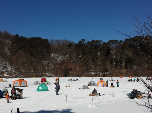 建国記念日の昨日は少しだけ暖かくて快晴陽気に誘われて何年かぶりにワカサギ釣りに行ってきました休日とあって氷の上は大勢の人が釣りを楽しんでいますスタートが遅かった私たちの釣果はたったの一匹(>_