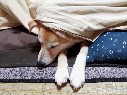 2月 きさらぎ 寒いですここ10日ほど風邪+アレルギーに襲われてぐずぐずと過ごしてしまいましたがやっと回復の兆しが見えてきてヤレヤレです先週はマイナス15℃まで下がる寒い朝があって廊下に置いてあるはる用のお皿の水や台所の布巾が凍ったりとビックリの日が何日かありましたけどその寒さも峠を超えたらしくマイナスも5℃~10℃に落ち着いてきました明日は節分ですものね道路の雪が解けないのを口実にしてはるの散歩はサボってばかり寒いし散歩はしてもらえないしちょっと拗ねてるはるは「あたしはここがいいの!」と言わんばかりに今日も炬燵に潜り込んでいます(笑)