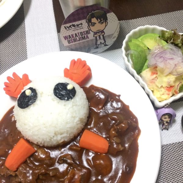 お盆で何かとやらなければならないことがいっぱいな筈なのに、今日も今日とてオタ飯なのでございます。 という訳で本日は『ハイキュー‼︎』から絶対王者白鳥沢学園排球部主将、牛島若利くんのお誕生日に託けて、彼の好きな"ハヤシライス"を作ってみました。 やはりバレーボールと言えばバボちゃん…は、ちょっと安易過ぎたかな。 でも中学の頃から怪童と呼ばれ、世界ユースにも選ばれた実力の持ち主で、努力する力も才能も確固たる自信も持ち合わせた彼が【天然】だと知ってしまったら…ちょっとこんなご飯を食べているところも見てみたくなるというものです。 あまり表情が変わらない、一見強面そうな彼もまだ高校生。1度位はあの個性豊かなチームメイト達と一緒に思いっきり破顔しているところなんかも見てみたいなぁ。 因みに食べながら主人からは『何故バボちゃん❓』と何度も聞かれてしまいました。 実は昔、バレーボールの試合を観に行って選手の方々とツーショットを撮るチャンスがあったにも拘らず、迷わず通りすがりのバボちゃんと一緒に写真に収まった根っからなわたくし…。 牛島くんも好きですが、バボちゃんの魅力にも抗えないのです。 でも今回、デザートが間に合わなかったから近々ちゃんと作り直す…かも❓ ハイキュー!! ビジュアル色紙コレクション3 牛島 若利 単品