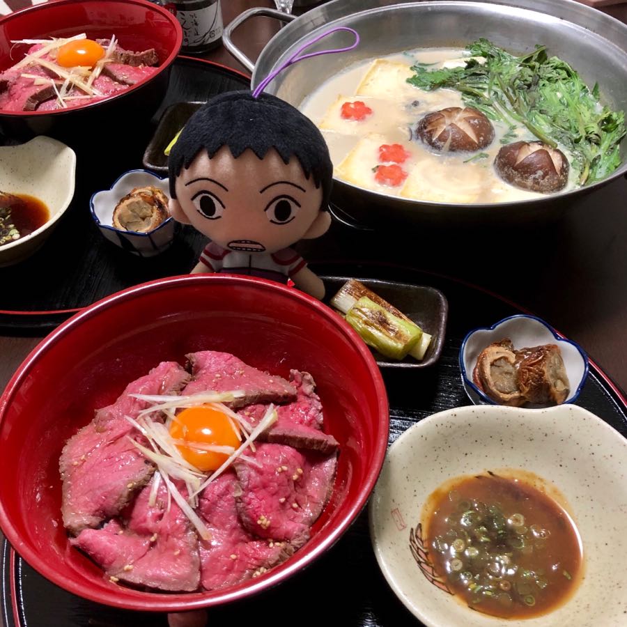 本日11月29日は"いい肉の日"、そして『弱虫ペダル』京都伏見高校の変態マッサージャーにして我が愛しの御堂筋翔くんの忠実なるしもべ、いや一番弟子、岸神小鞠くんのお誕生日ということで… 「御堂筋さん、あなたのための『最上級筋肉(よきにく)』です‼️」丼。御堂筋くんの好きなお豆腐と共にドドーンとご用意してみました。お誕生日ご飯ということで、"なんちゃってペダルカフェ"も久々の開店です。 いい肉の日だからってスーパーで「筋肉(にく)をチラチラ見せつけられて……じっとしてられるわけないじゃないですか‼️」(は❓) 小鞠くんの、ではなくまるで御堂筋くんのためのメニューになっておりますが、彼の望みはそれを食べることより触ること。 思わず自己を投影をせずにいられないこの言動、アニメでも御堂筋くんのためにお肉の塊をこねくり回して喜んでいたので、まぁこれが正解…だと思われます。 私も小鞠くんになったつもりで御堂筋くんの為に今回かなり奮発して最上級筋肉(よきにく)をGET。 アニメのレシピどおり柚子胡椒をたっぷり擦り込んで作るローストビーフ、御堂筋くんが喜んでくれるなら至上の喜びです。 …って、よく見たらこの人ナイフとフォークを持ってスタンバイしてるんですよね…洋食、洋食派だったの⁉️みどくん❗️戯言はさて置き、奮発した甲斐あってやはり"よきにく"は最高でした。 そして食後のデザートは勿論小鞠くんからの差し入れ、桜餅。 食べきれない上に明日からはお茶漬け生活やで、みどくん…。弱虫ペダル 34巻
