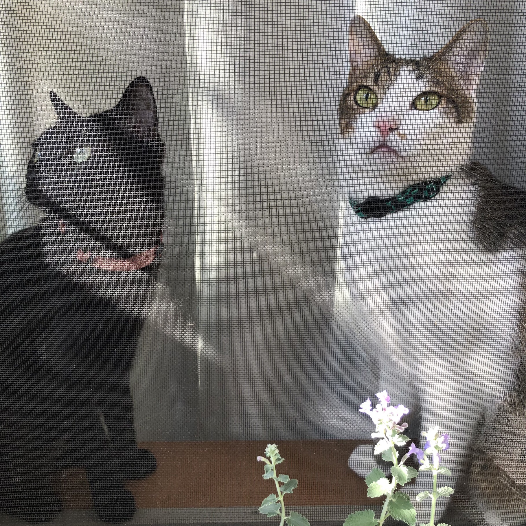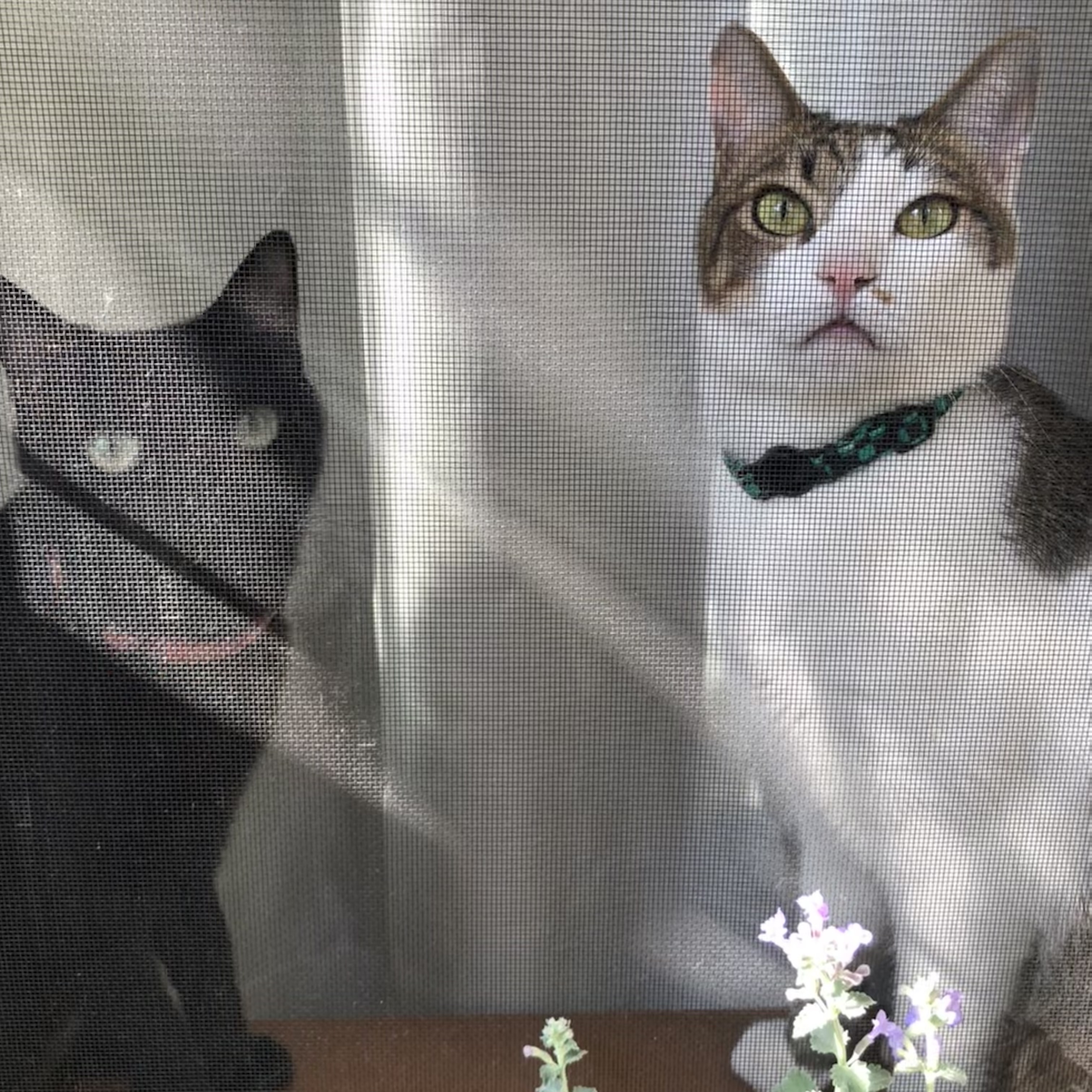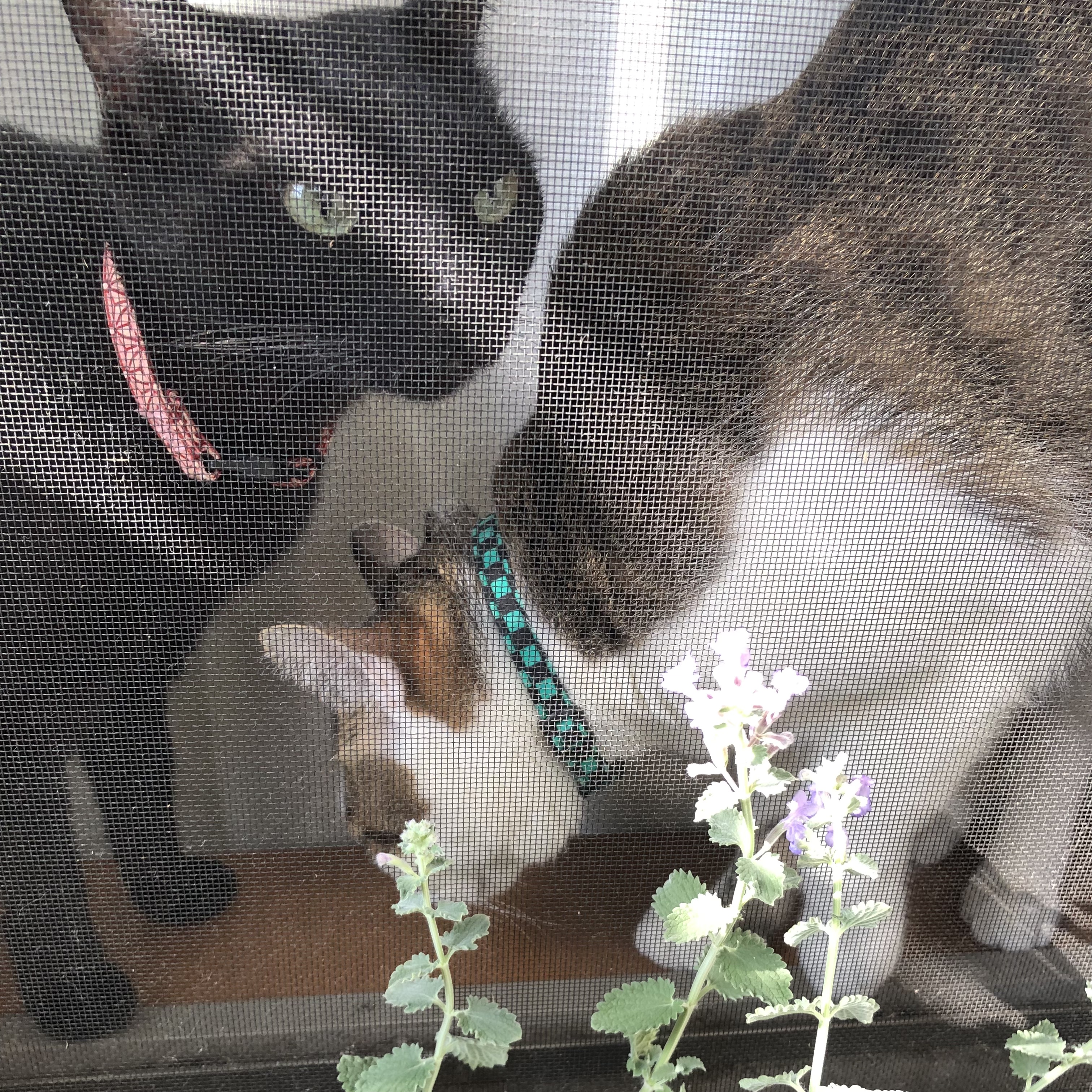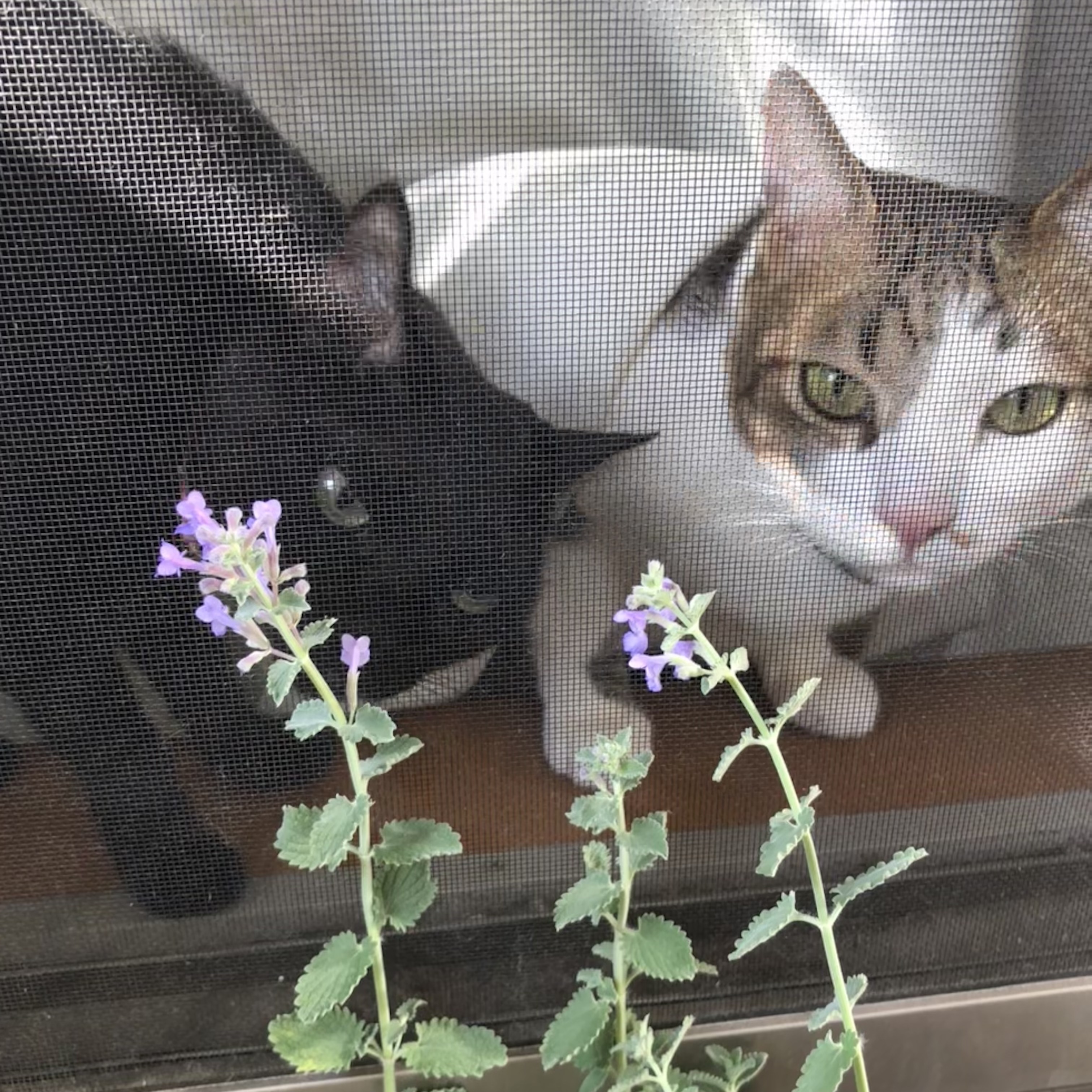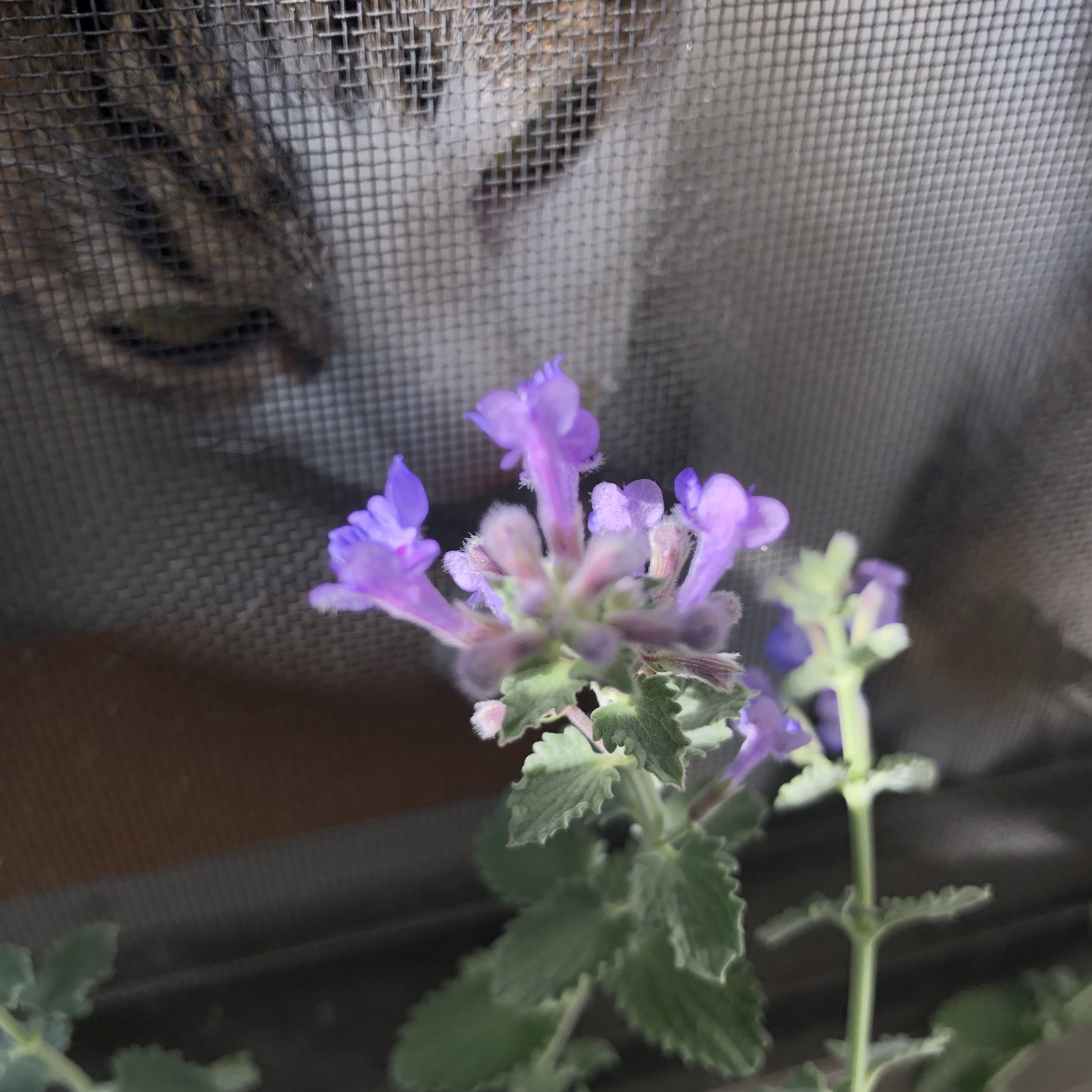 ニャンズも興味津々で見に来たので窓越しにお披露目、キャットミントと言うだけあって猫を惹きつけてしまうのかな。