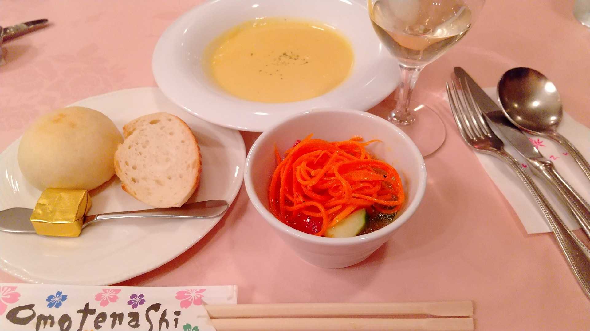 その後、野菜のマリネ、ポタージュスープ、パンが続きます😊