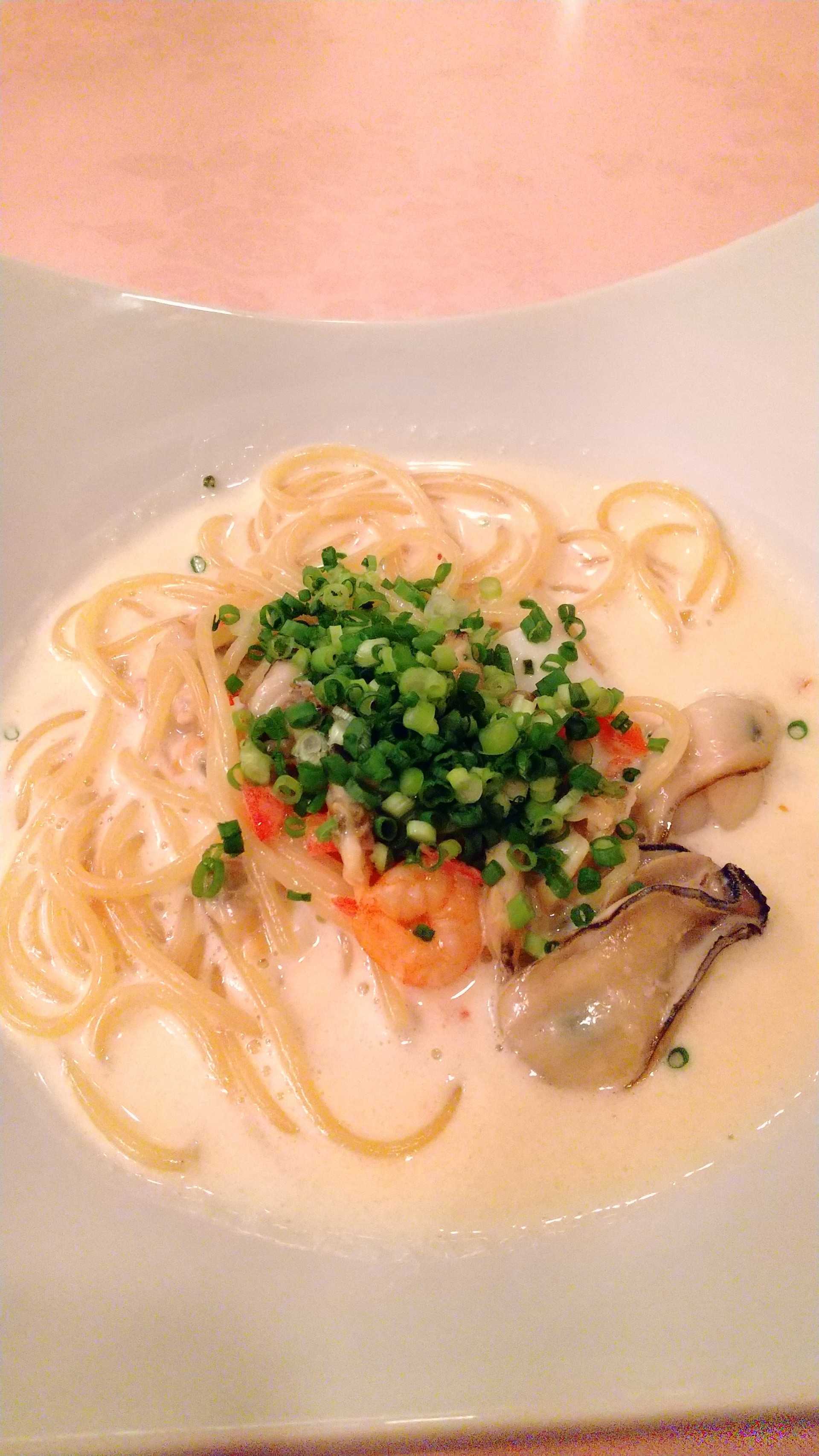 パスタは、牡蠣やアサリ、海老の入ったクリーム系のスープパスタで、