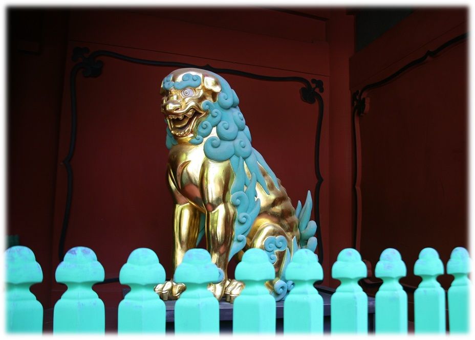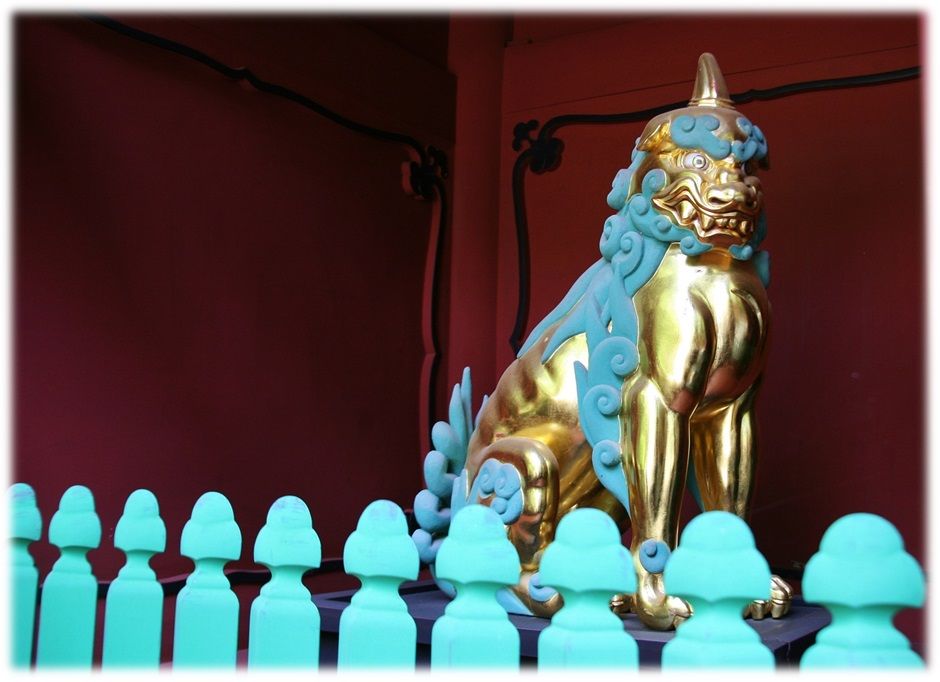 金剛柵内の左の角がある方は狛犬、右の角が無い方は狛獅子、いずれも艶やかな彩色です