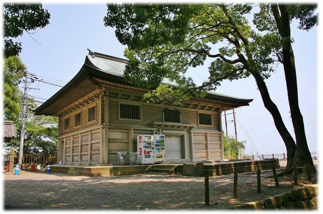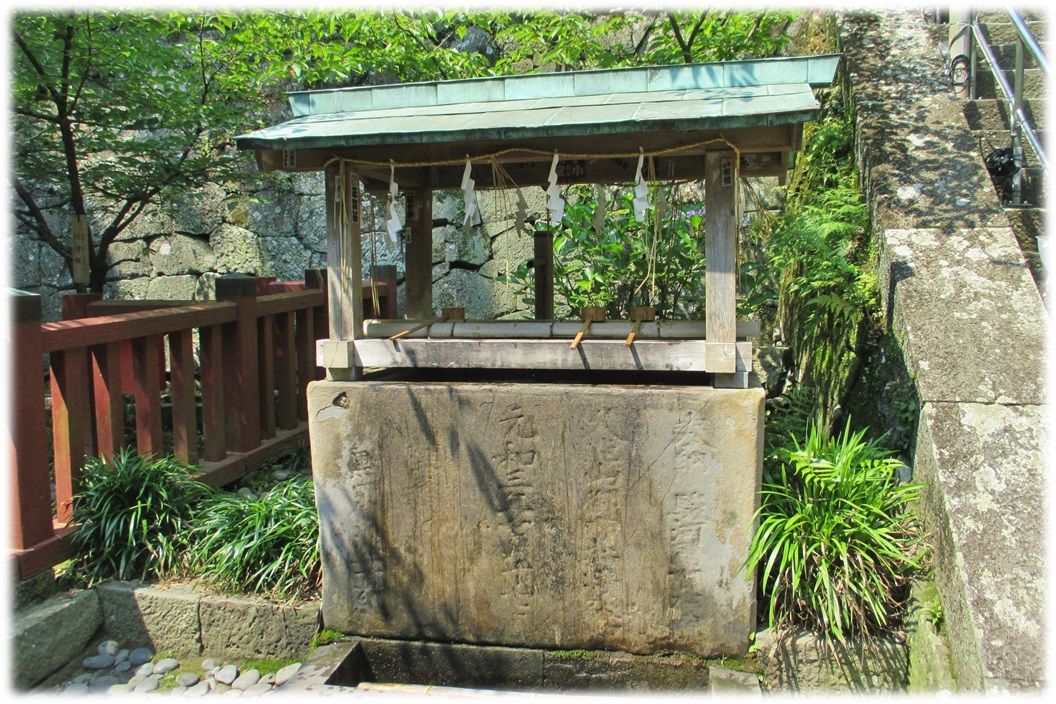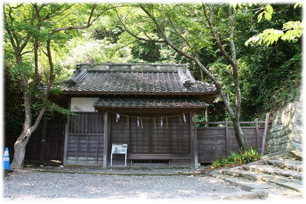 石段を上りきると右側が開け見えてくるのが旧宝物館、その左に勘介井戸があります