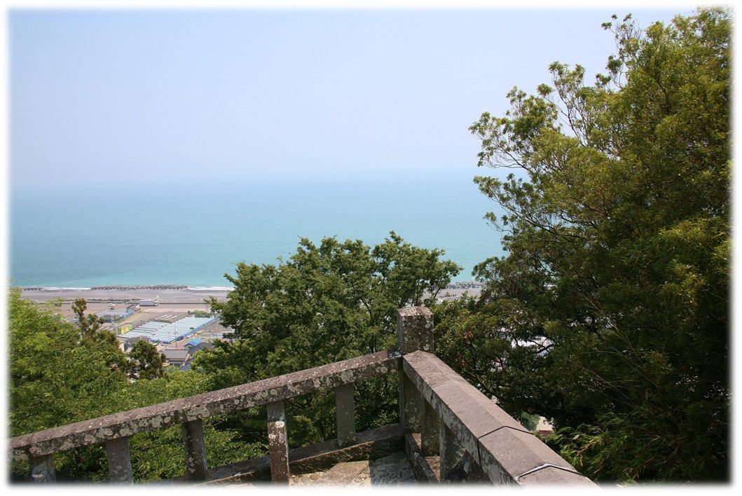 くねくね折り返し上ってきた参道と眼下の街並み、その先に駿河湾が広がる絶景を望めます