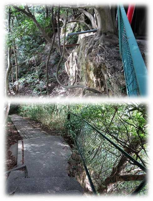 参道左側の切り立った崖、フェンスは付いているものの崩壊は進んでいるようです。