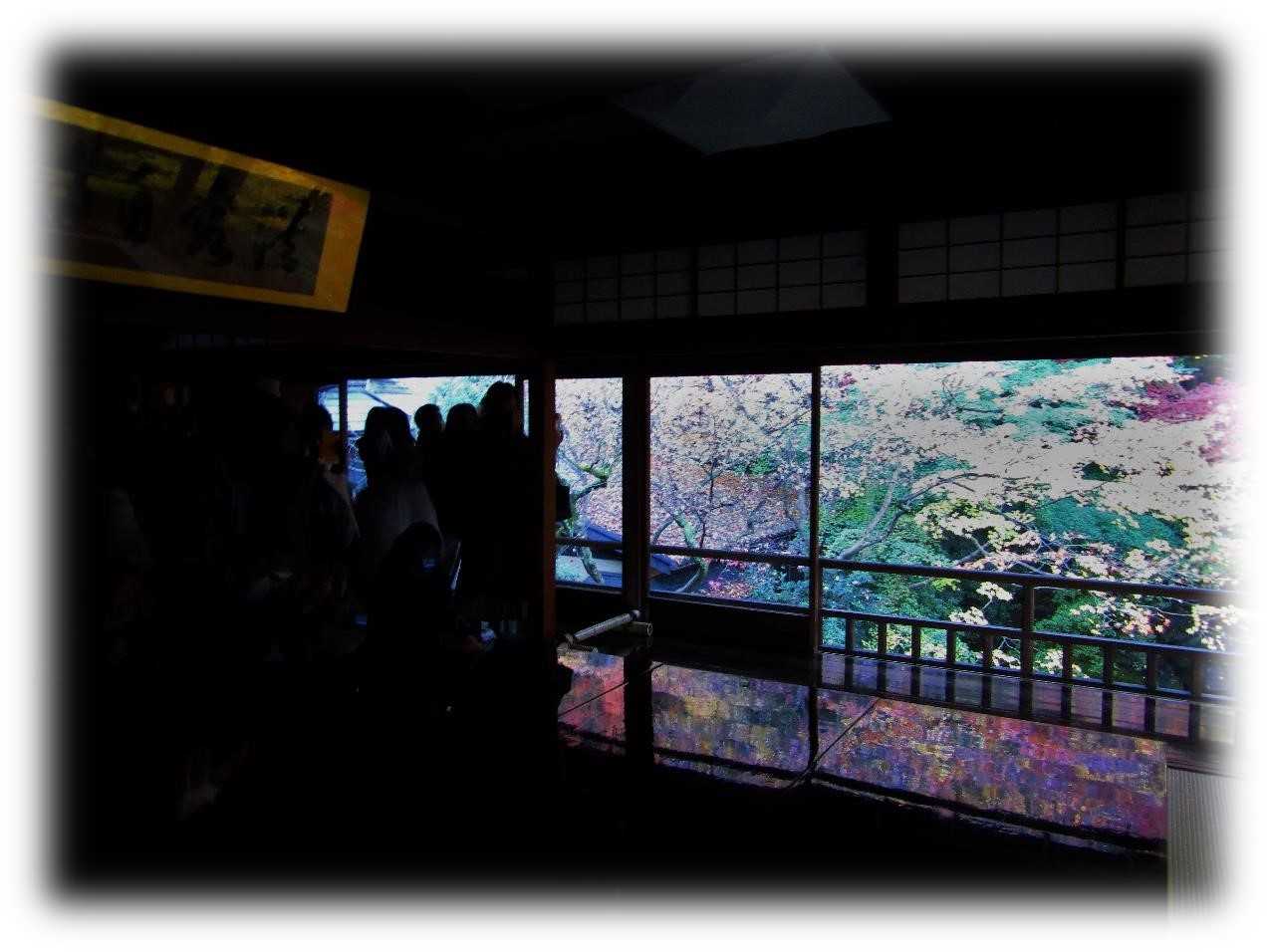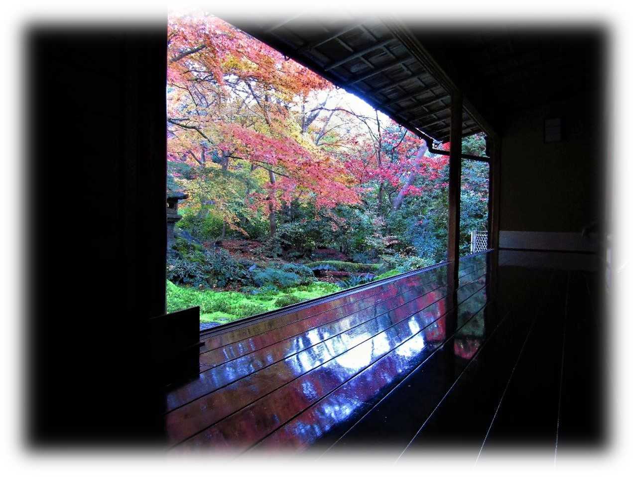二階の混み方に対し、一階はさほどでもなく、磨き抜かれた廊下に映り込む紅葉も同様に美しいものがある。