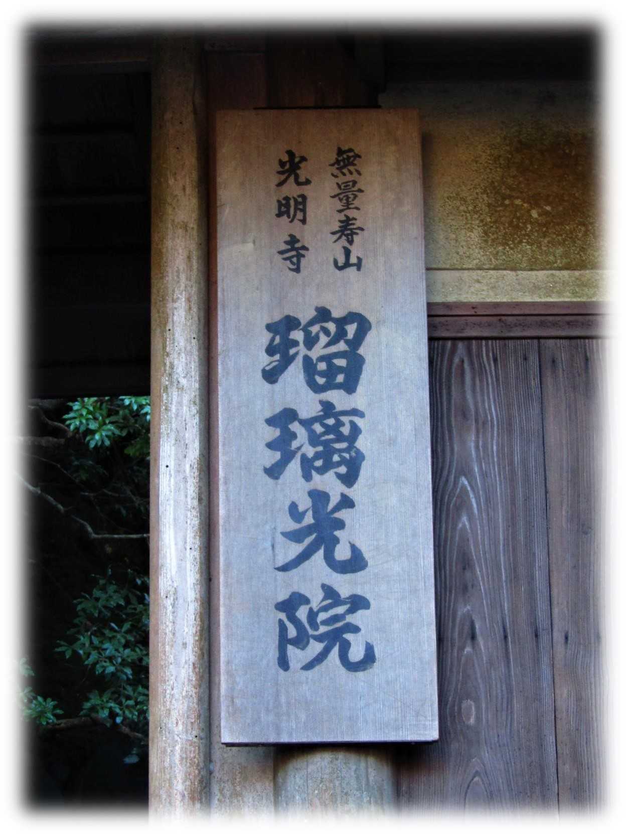 山門右に「無量寿山光明寺 瑠璃光院」の寺名札。