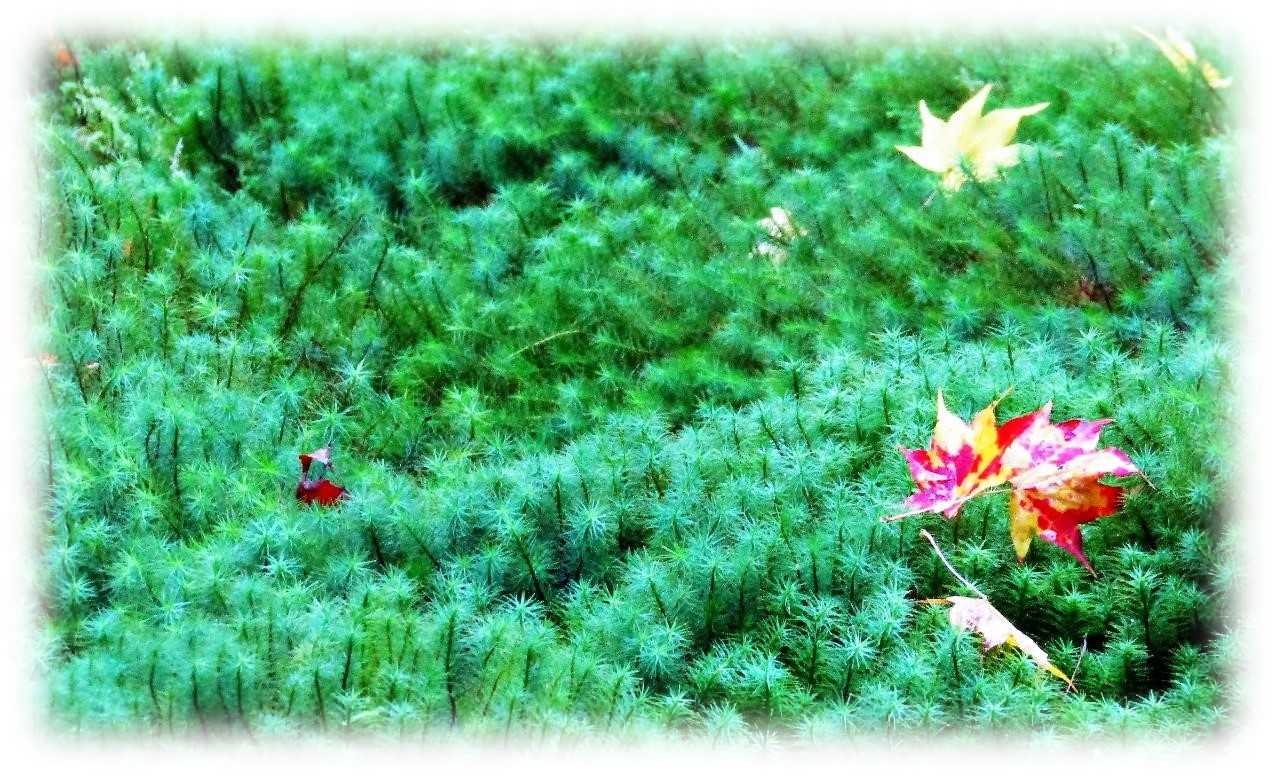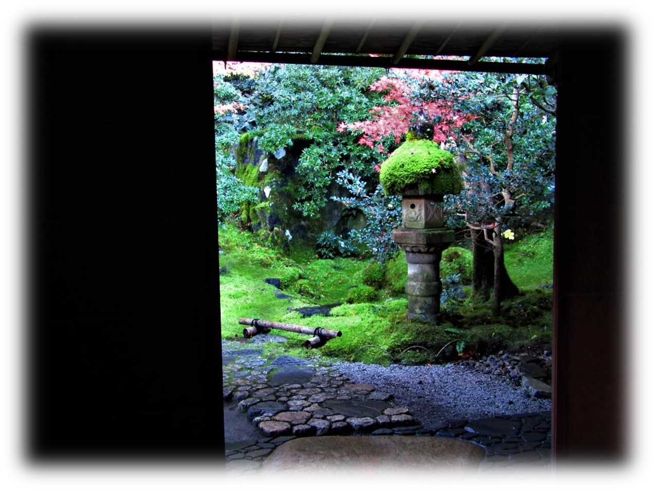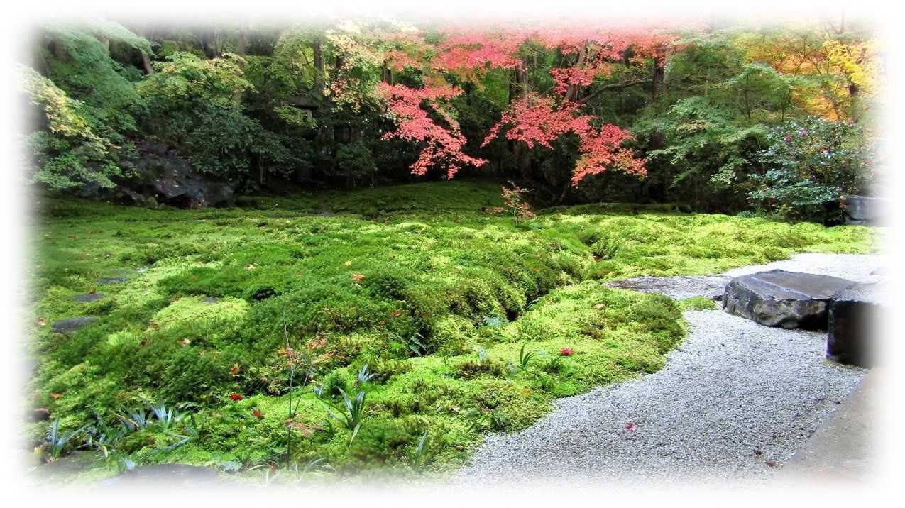 瑠璃色に輝く浄土の世界を表わした主庭で数十種の苔の絨毯の中に細いせせらぎが流れています。