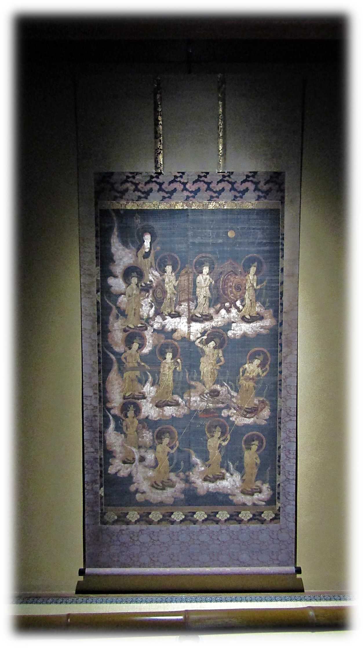 多くの菩薩をともなった阿弥陀如来が、極楽浄土から雲に乗って臨終の者のところに現れるようすが描かれたもの。室町時代に描かれたもの。