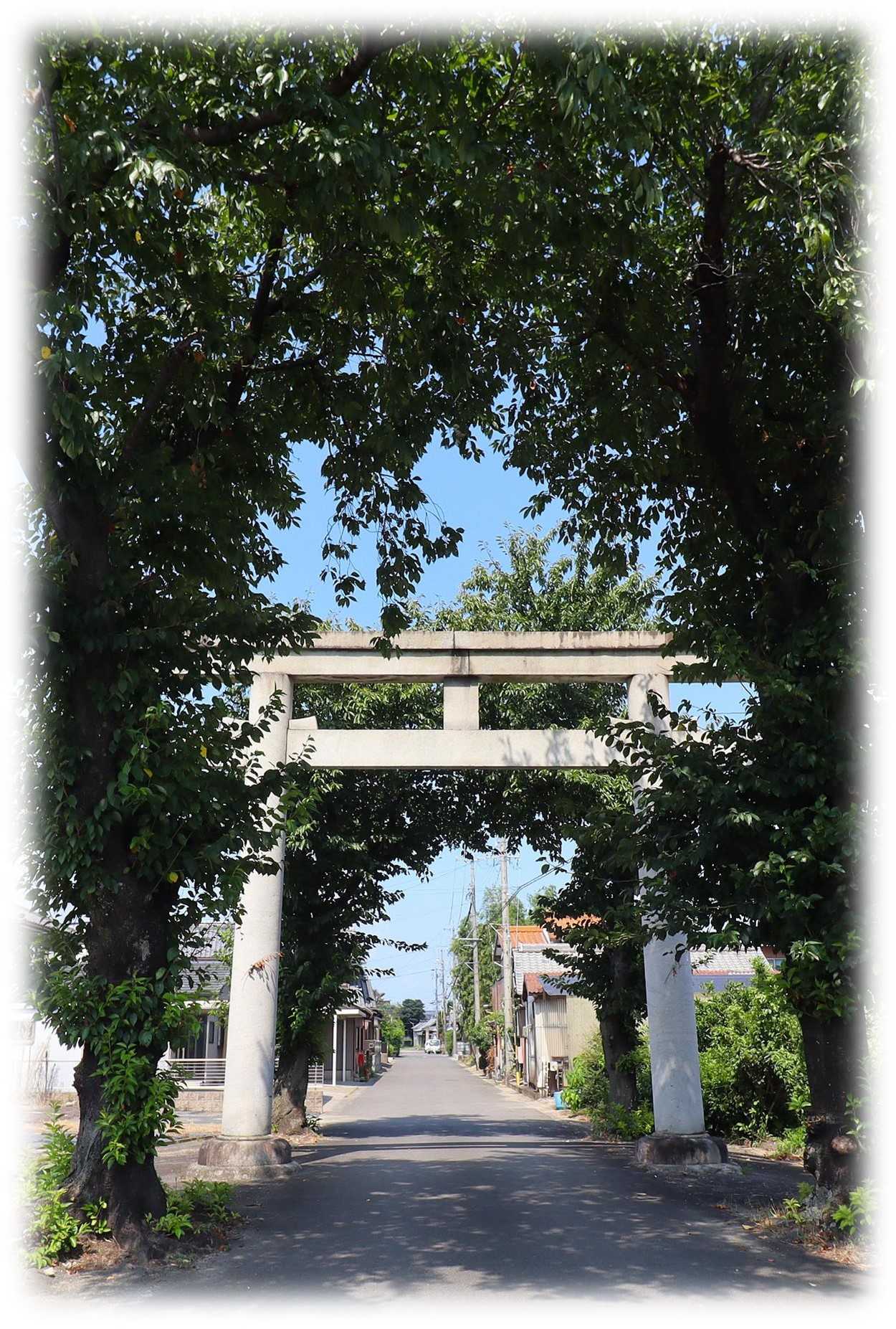 右手に大正8年(1919)に寄進された「熱田神社」社標が建てられ、道路を跨ぐように石造の明神鳥居が立っています。