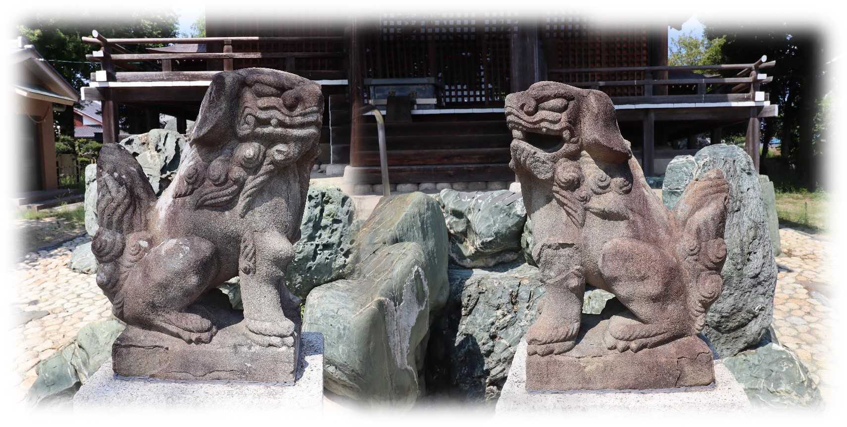 木造入母屋造で千鳥破風と大きな向拝を持つ風化のある佇まいで、手前で一対の狛犬が守護しています。