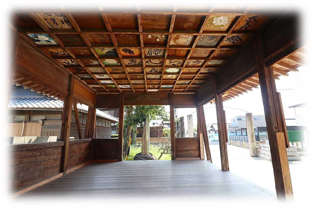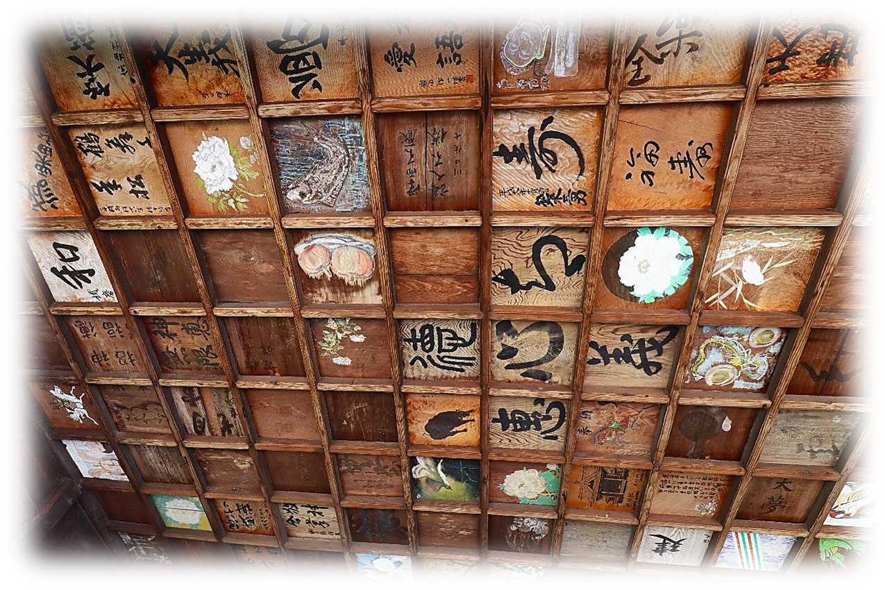 氏子達の手によるものだろうか、格子天井には書や絵が描かれています。