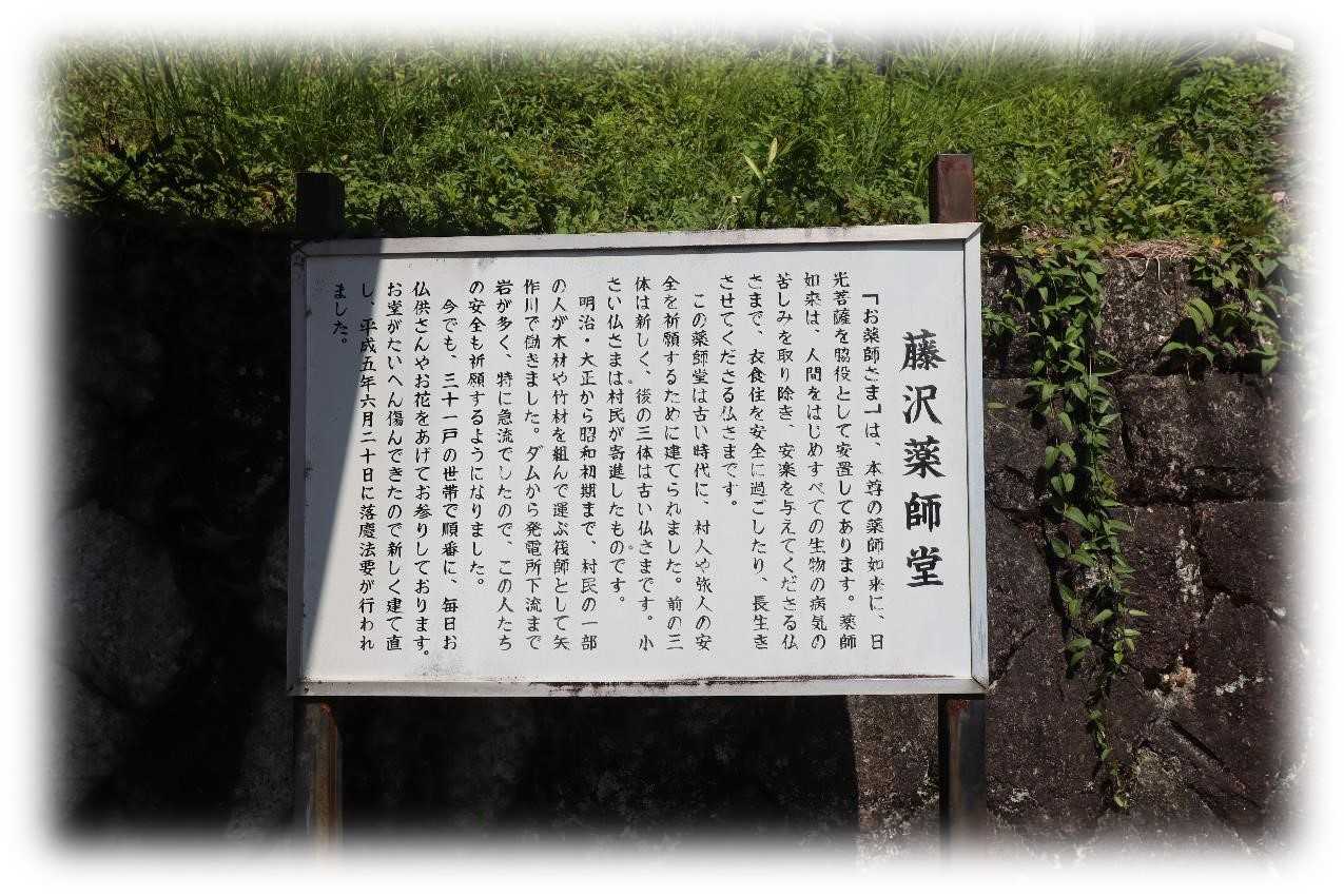 藤沢薬師堂は藤沢町の入口の山裾に建てられ、現在の堂は平成5年に建替えられた入母屋瓦葺の妻入りの堂で、外陣は吹き抜けの床板張り、内陣が本尊を安置する堂になっています。