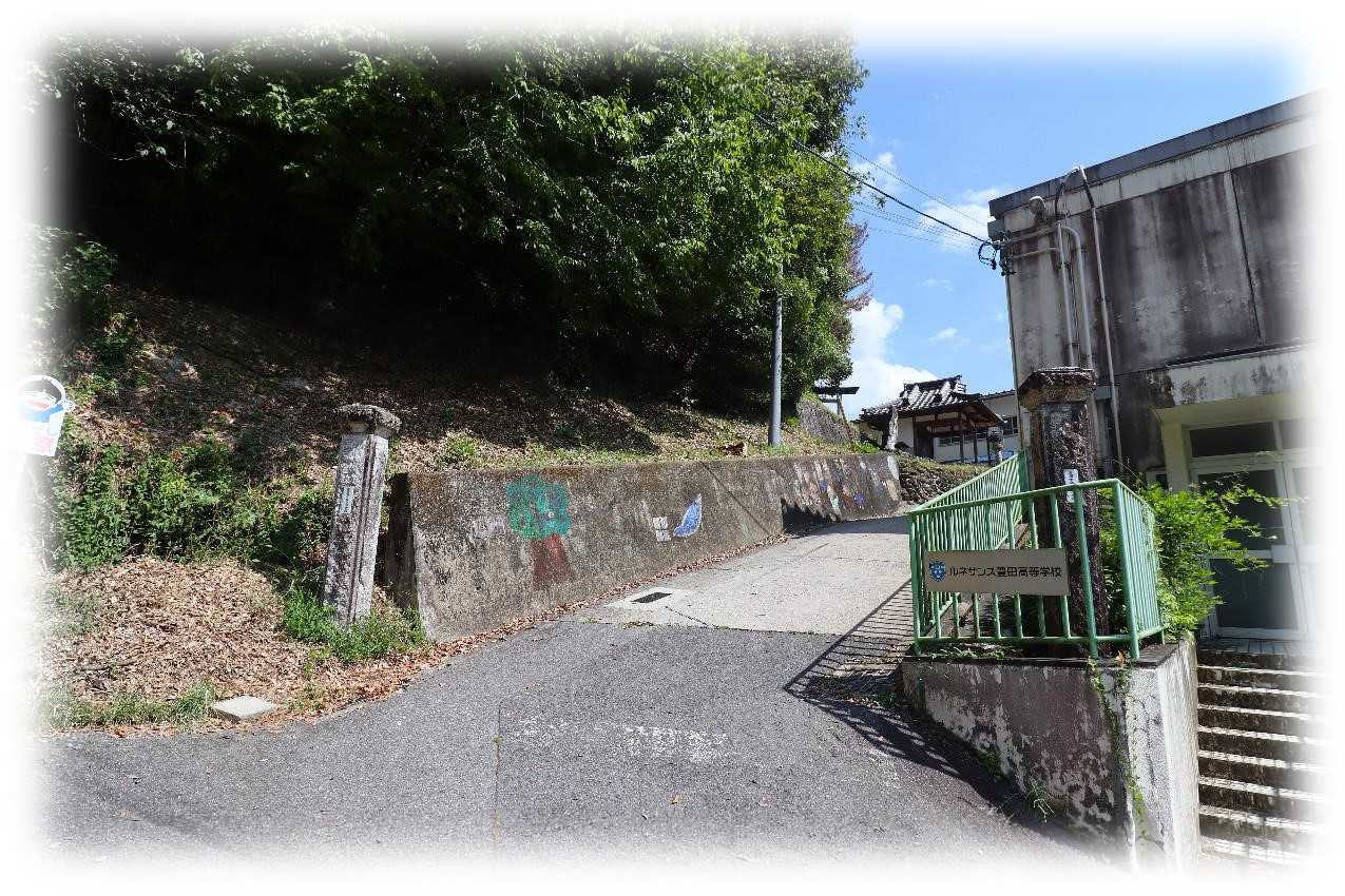 県道から細い道を左に入るとすぐ右にルネッサンス高等学校の校舎が現れます。