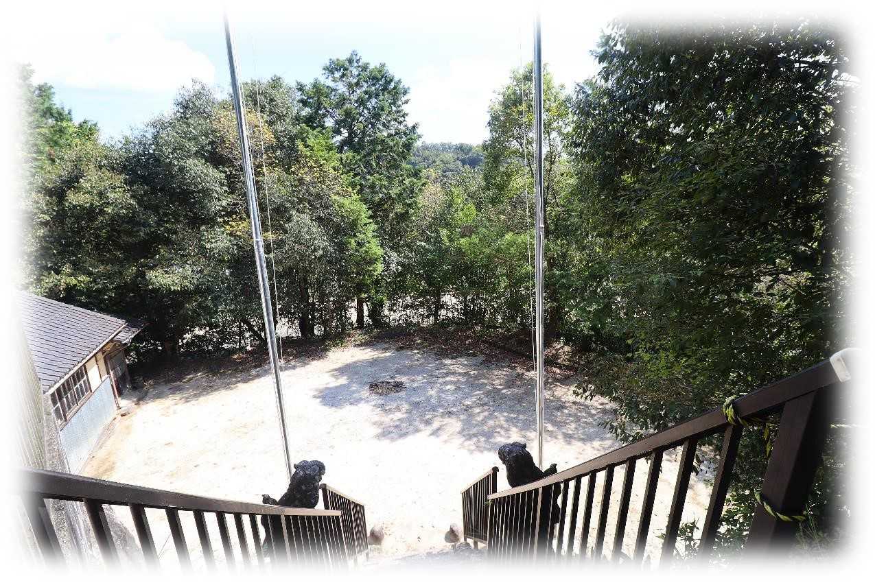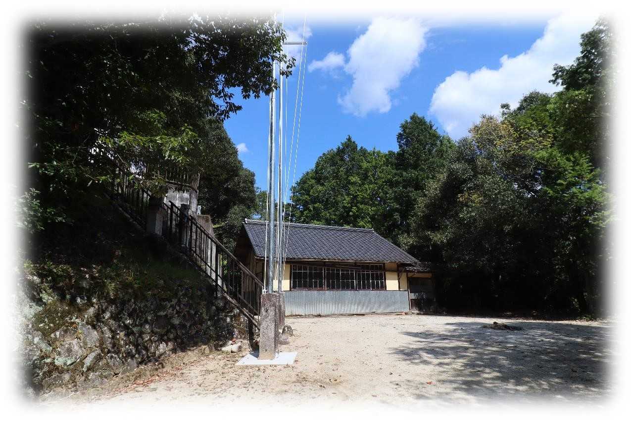 校舎の裏側の山肌を整地した広い境内、正面に見えているのが社務所だと思われます。
