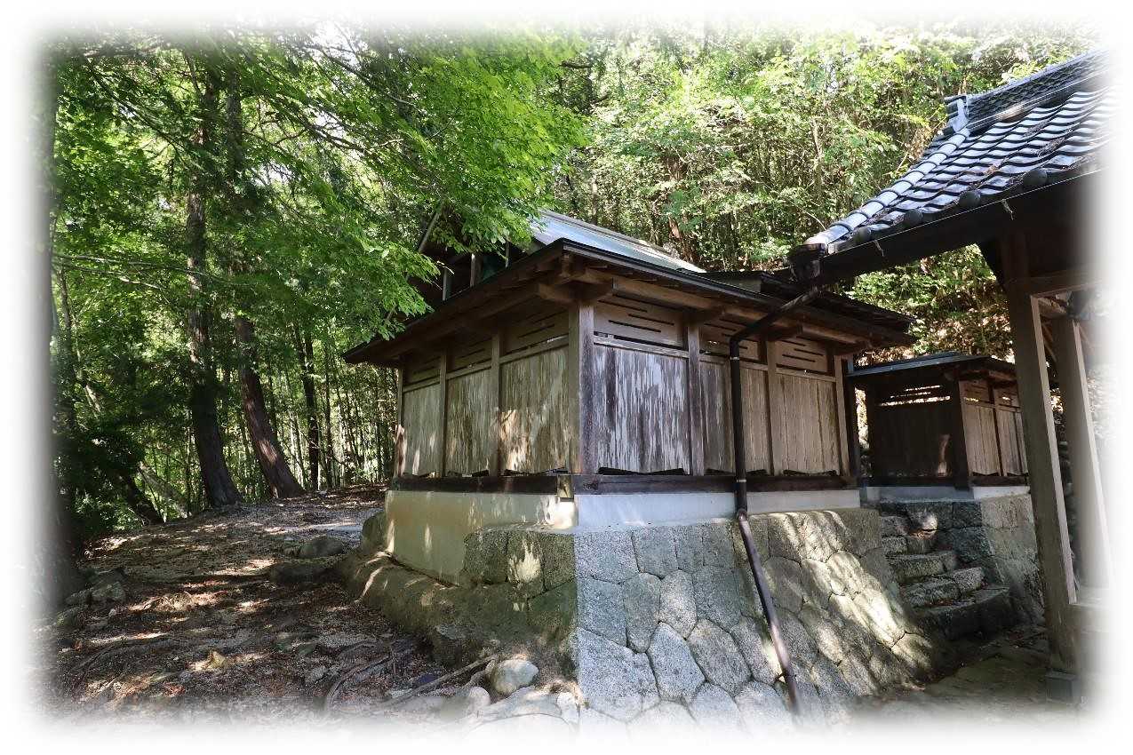 透かし塀が両側面から神門に繋がるもので、側面に回り込むと覆殿が露わになる。