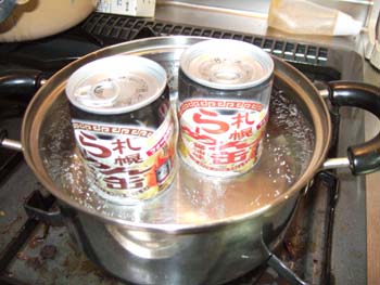 以前職場の人からお土産で貰った今話題沸騰中??の『札幌らーめん缶』を食べました。まず湯せんで温めま~す。温めているあいだに付属のスプーンを用意します。二つ折りをただまっすぐ伸ばすだけなんですけどね。で、温まったら蓋を開けてと。。。具は、メンマ数本とちっちゃなチャーシューが申し訳なさそうに入ってました。味噌も醤油も具は一緒ですね。この麺がウリの蒟蒻麺です。醤油と味噌両方食べましたが、オヤヂは味噌の方がいいかなぁ。麺は、見た目、味、食感共にラーメンの麺とは違いますね。どちらかと言うと、ちょっと固めのシラタキってカンジかなぁぁ。子供たちは『旨い、美味い』と食べていましたが、嫁ハンは・・・・・・だそうです。機会があれば、話のタネにぜひ食べてみてくださ~い。。