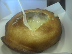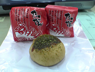 昨日大阪に出張に行ってた人からお土産もらいました本物のたこ焼きみたいでしょ?『たこやん』って和菓子でした。お饅頭なんですよ。お味は・・・ん?たこ焼きの味はしませんね。お饅頭の味ですが、美味しいです。うちの課では、チョット出張行っただけでも、みんなお土産買ってきてくれるので、いろんな面白いものや珍しいものが口にはいるんですよ。でも自分が出張行った時はみんなの期待に応えようと出張中の仕事より一生懸命にお土産を探しています