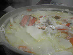 今日は天気良かったんだけど、結構寒かったぁ。と言うわけで、我が家の晩ご飯は故郷北海道の郷土料理(?)石狩鍋!みなさんご存知ですか?石狩鍋。具材は、生ジャケ(鮭)のアラ、大根、人参、白菜、ジャガイモ、えのき、じめじ、ネギ、しらたき等をたっぷりいれて合わせ味噌と少々のみりんで味付けです。こんなカンジに仕上がります。ちょっとシャケ少なかったかな?北海道では、いつでもどこでも生ジャケのアラや切り身が手に入ってたんですがここではなかなか手に入りません。ってか手に入っても高いし・・・。塩鮭のアラや、トラウトサーモンのアラや身は売ってるんだけどね。生ジャケになるとなかなか・・・。で、今回は仕方ないのでトラウトサーモンを使用。そのまま使うと鍋の中にオレンジ色の脂が出てくるので、少し湯通して脂抜きして使用しました。京都に来てはや7年。この石狩鍋を食べるたびに道産子魂が燃え上がりマス。寒い夜にはサイコーですよ。みなさんもぜひ一度お試しあれ!