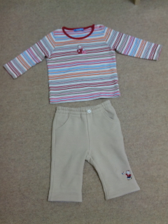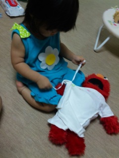 エルモに新生児の時に来てた肌着を着せてお母さんゴッコをしました。いつもママにしてもらってるようにエルモを抱っこしようと肌着の紐を首にかけようとしてたら、ママが身体にくくりつけてくれました。エルモちゃんヨシヨシいい子いい子~☆ ママは私がママのマネをする姿を見てビックリ仰天してました。