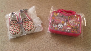 今日はヤマトのお兄さんがきました。とんPねーちゃんからのプレゼントが届きました。グラグラのコスメセットと靴。ありがとう。パジャマですがさっそく試着。サイズokでした。裸足だからすこしブカブカだけど靴下はいたら良かったよ。ド派手な服装の時はこの靴をはく事にします。