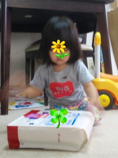 お昼寝から目覚めてしばらくするとピンポーン、とまたまたまたチャイムが鳴りました。???と思っているとヤマトのお兄さんでした。本日二回目の対面です。今度はなんとパパのおねーちゃんからでした。さっそくママに開けてっていいました。なんとマドレーヌちゃんのお人形!!ありがとう。