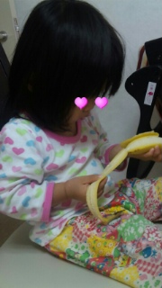 今日はバナナの皮がめくれるようになりました。そして、自分で持ってパクリっ。初めてバナナを食べた時は一口大にしてママにスプーンで口に運んでもらってました。次第にかぶりついて食べれるようになりついには自分で持って食べれるようになり 今日は皮を引っ張って剥くことができました。大分進歩した。