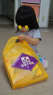 ママに開けるように袋を持って行きました。