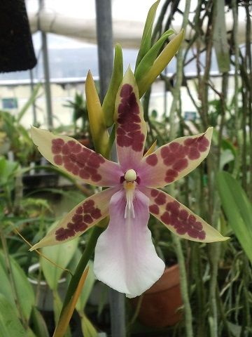Pps.laycockiiパラファレノプシス属の原種、レイコッキーです。ボルネオ島の中南部の低地に自生する着生ランです。葉は棒状で根が太く高温を好みます。Gga.galeata ゴンゴラ属の原種、ガレアータです。 メキシコの標高600~1800mに自生する着生ランです。何度も登場していますが別の株です。Ko.ionopteraケレンステイニア属の原種、イオノプテラです。エクアドルとペルーの標高900~2000m に自生します。去年は11月に咲いたのに、この時期に咲いてしまって花数も花径も小さいです。今日は昨日届いたミスト機を低温室に設置してみました。ハウス通路より少し中央寄りに片側9か所、両側で計18か所の噴霧口から霧が出ます。蛇口をひねれば水道の水圧で霧が出る仕組みですが何時間もかけてると通路に水がたまりそうです(^^;)また噴霧口の下、直径60~80cmくらいに集中するので棚全体にはかからないし、大きい葉があるとその下もかからない感じです。今日もよく晴れ22.1~34.6℃とまた猛暑になりました。明日は雨が降ったりやんだり、22~29℃の予報です。木曜日まで雨マークがあります。 にほんブログ村 メール欄