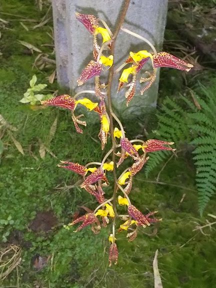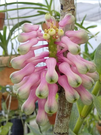 着生ランで普通は葉の落ちた古いバルブに花を付けます。