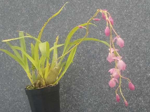 着生ランで葉の落ちた古いバルブに花を付けます。