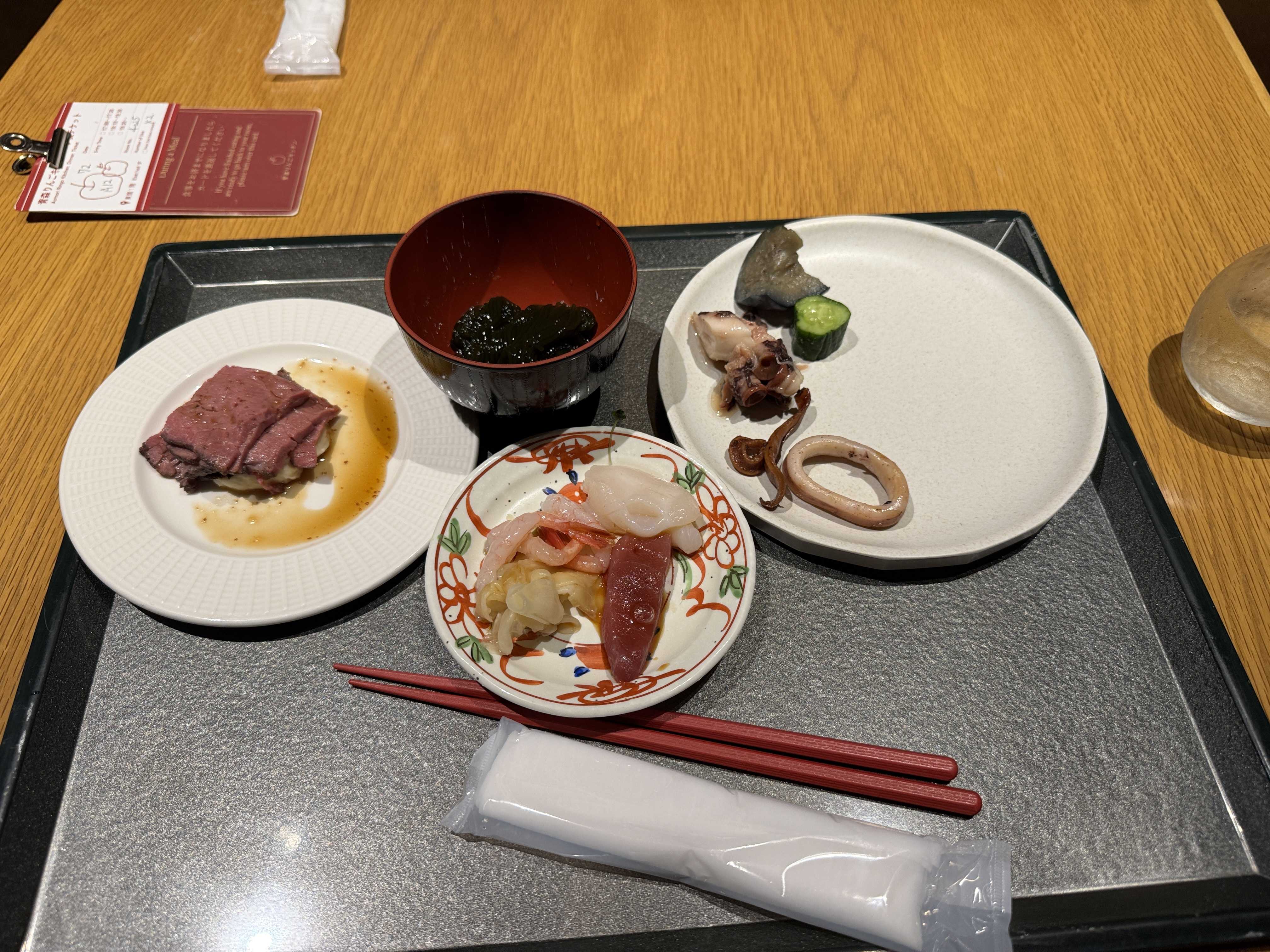スマホで専用のQRを読み込んで予約すると、受付番号と何番待ちか表示される。しばらくすると、「お席の準備が出来ました」と返信が来る。受付で番号を見せると、料理を説明しながら丁寧に案内してくれる。