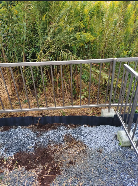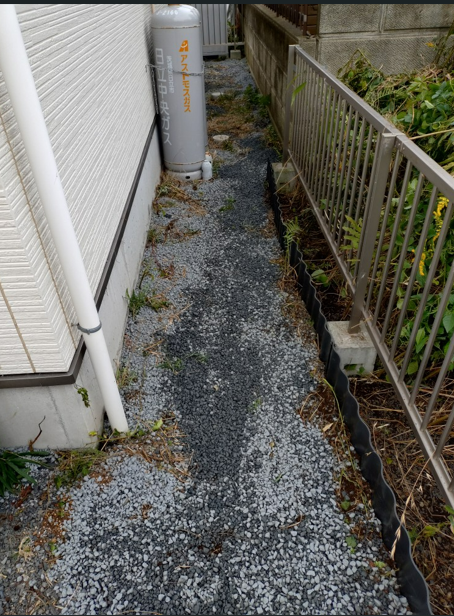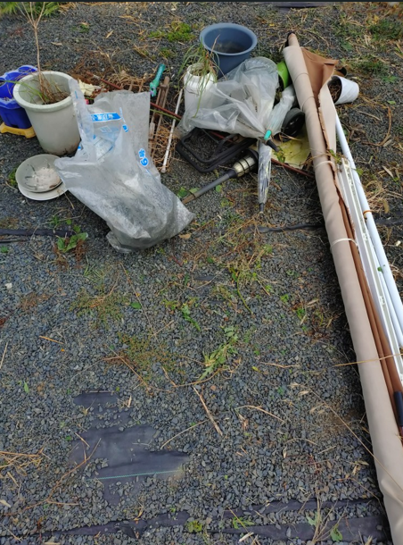 さすがに放置はできないので、今日は一日がかりで、草刈りと、フェンス修理(DIYで壊れた箇所の交換)、隣地との境界に波板設置、草が生えにくくなるように砂利の追加(20kg×30袋)、残置物の処分など行いました。