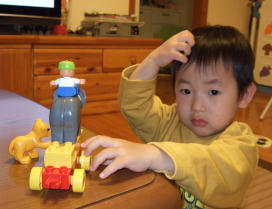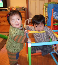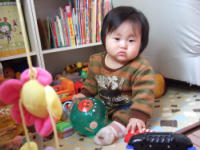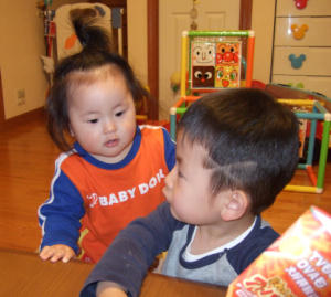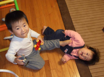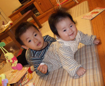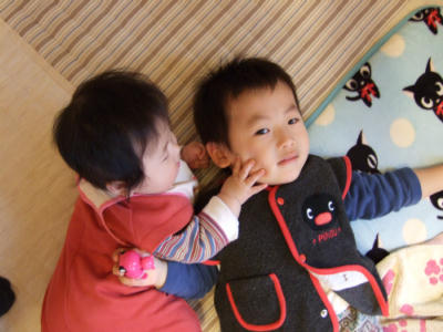 今日は朝から、市の「2歳半教室(仮名)」で、ヒィ君と保健センターへ行って来ました。ユズちゃんはおばぁちゃんちでお留守番です。ヒィ君は、首が据わるのも歩くのも、とっても遅かったのですが、言葉も遅く・・・2歳半になる今でも「ワンワン、パパ、ブーブ、ジューチュ(ジュース)」など、少ししか出てきません。こちらの言っていることは大半わかっているようですが・・・保健センターで相談して見ると、「他の2歳半の子と比べると、行動も少し赤ちゃんっぽいし 言葉もだいぶ遅れてますね・・・」と言われました。で 。2月に養護学校の先生や小児精神医療(?忘れた)専門の先生の定期健診があるからそちらに来てみては・・・と言われたので、お願いして来ました。言葉が遅いのはいいんだけど・・・他に異常があるのかも・・・と考えると結構ブルーになってきてしまいました。その後、保育園に連れて行って先生にも話したのですが、先生は「今のところ、他の子とさほど変わらないように見えますよ。大丈夫ですよ!そのうち話し出しますよ」と言ってくれましたが・・・。他の子、みんな話すどころか『会話』が出来るんだよなヒィ君は、可愛い。でも、すっごく怖がりで弱虫。それが個性で性格ならいいんだけど・・・どうなんだろう。誰も見ていないと、妹を突き飛ばしたりペンペンしているのは・・・これは、普通のコトですよねヤキモチ?威嚇?ユズちゃんはヒィ君が大好きみたいで、常にハイハイで追っています。ま。仲良しの時も、ちゃんとありますけどね